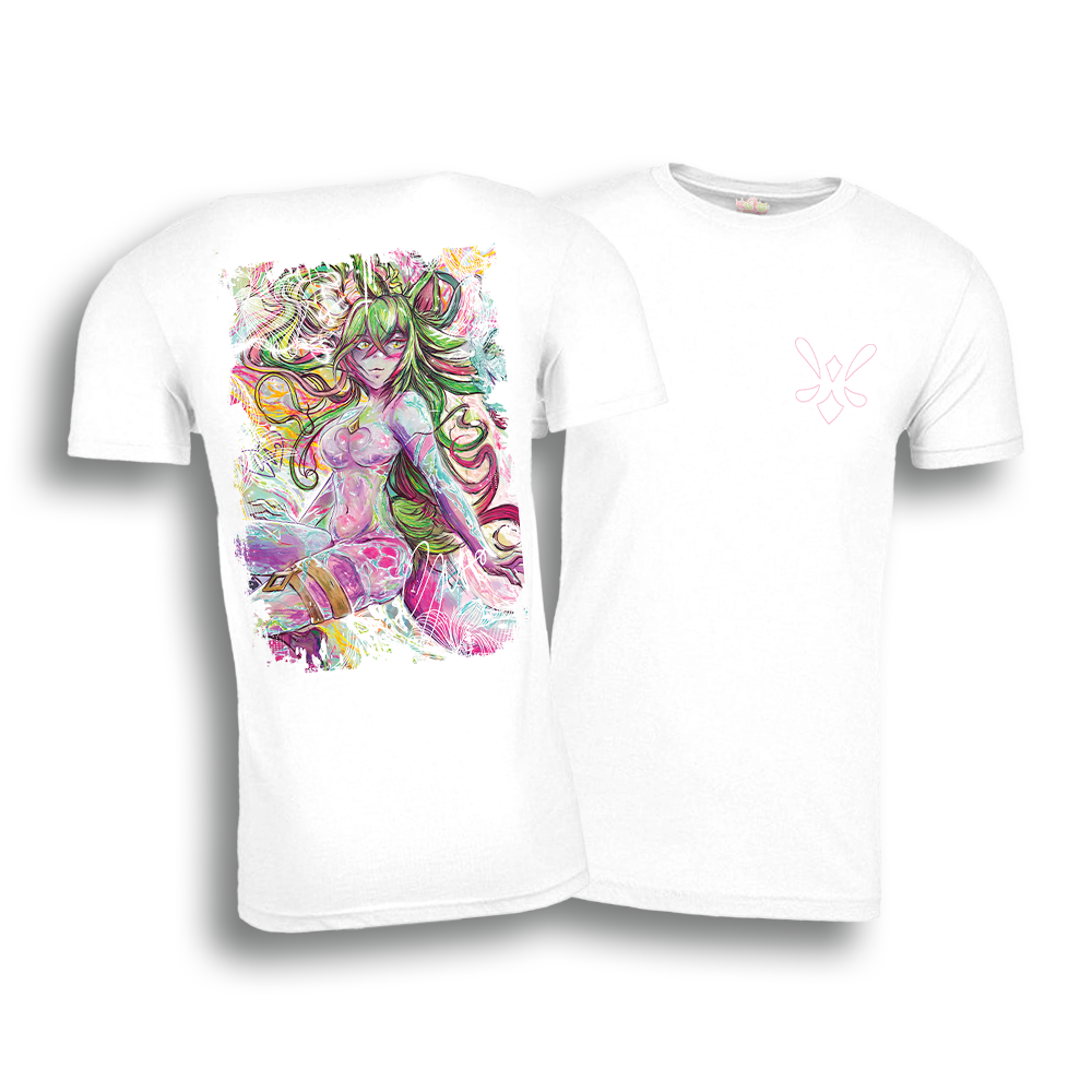 This t-shirt features a stunning print of Suto's VTuber model as a traditional painting, brought to life with vibrant details and a luminous design. Inspired by Hextech and Arcane aesthetics, it showcases glowing magical elements and crystalline highlights. Suto’s hybrid cat-axolotl features, including her four cat ears, tail, and elegant horns are beautifully rendered with an ethereal backdrop enhancing the captivating artistry.